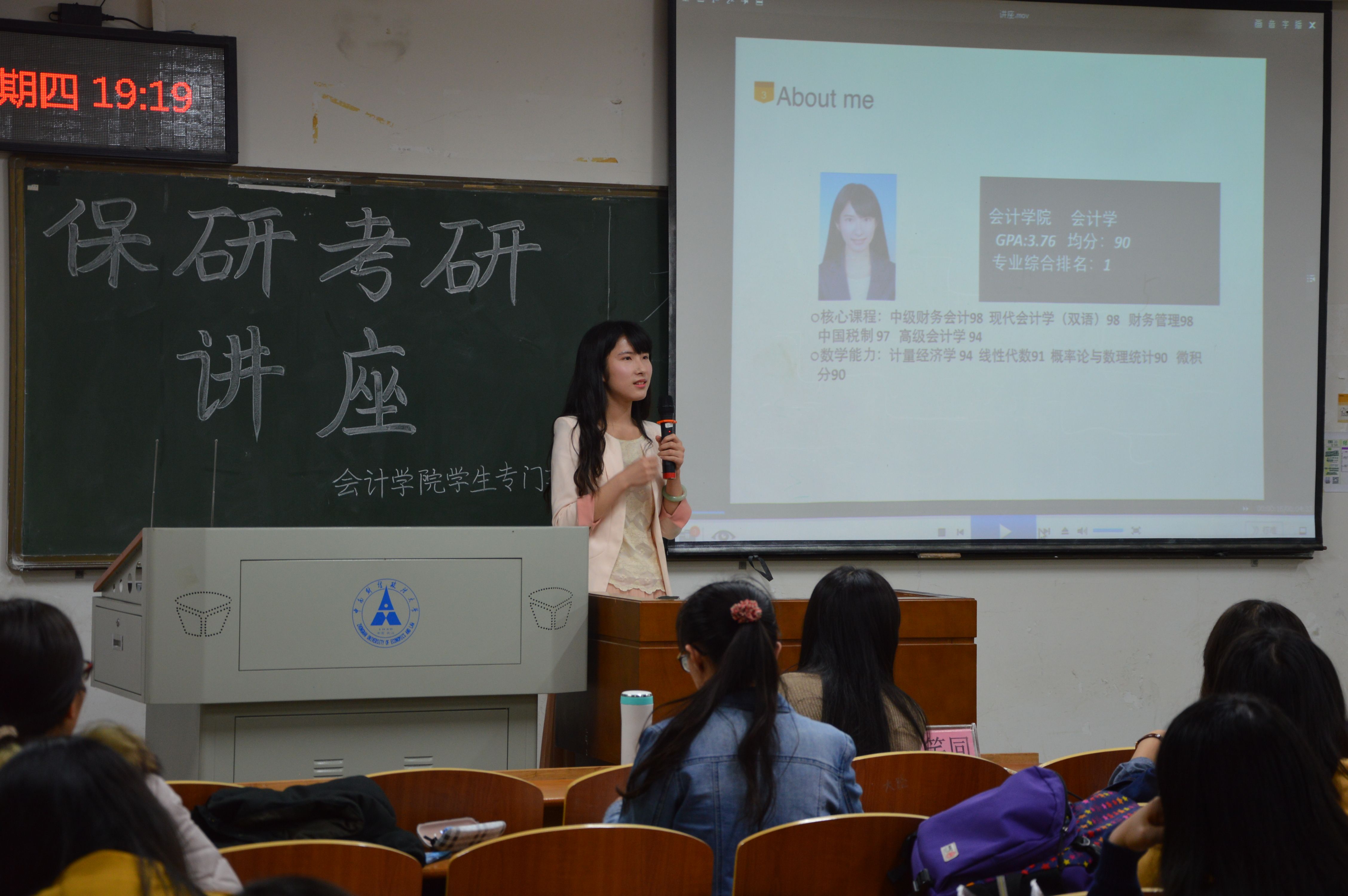 同是11级的黄迪晨,依靠自身的努力以优秀的成绩考取了上海财经大学2015年硕士研究生,在此次讲座中就考研的经验和大家进行了深入的交流。黄迪晨师姐先向大家介绍了考研所需的准备工作和考研具体流程,然后就其自身的经历和大家分享了她考研的经验,主要涉及复习时间安排、公共课和专业课的复习安排和方法。最后,黄迪晨还跟大家分享了她考研时的心路历程,嘱咐在座同学们,不要惧怕报考名校,要顺应自己的内心,考研并不是为了逃避社会和就业,而是要选择喜欢的学校进行深入的学习。