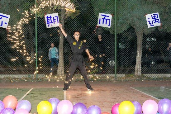 接下来的环节“初见悸动”更是精彩纷呈。该环节中,同学们以小组为单位,积极参与游戏,获得胜利的小组还能够赢取精美礼品。其中,游戏“争分夺秒”是各队伍队员将物品依次传递给下一个人,最快用钥匙把锁打开的队伍获胜,考验了各组队员间的配合和默契;游戏“东拼西凑”则是两人一队,现场寻找主持人提出的物品,快者获胜;而最后的游戏环节“正义对决”则为两位男生拔河,率先吃到棉花糖者获胜。游戏期间,还穿插了幻影魔术社和双节棍协会带来的精彩魔术表演和双节棍演出。其中,双节棍协会带来的“焰火双节棍”表演,用绚烂的火花将鸟笼体育场点亮,将全场气氛推向高潮。
