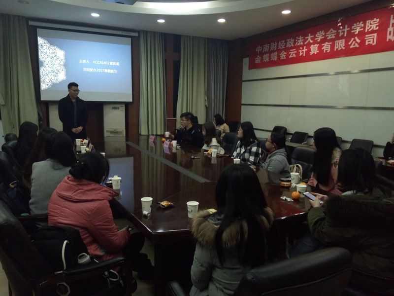 晚上七点半,实习交流座谈会准时开始。主持人朱珠首先致辞并向与会人员介绍了本次座谈会的主讲人,分别是来自CGA1401的燕蓓宁、ACCA401的翁克成、ACCA1501的王梓成以及财管1501的曾雅欣。本次座谈会的第一个环节是实习经验座谈分享,第一位主讲人是获得深圳普华2017暑期实习的燕蓓宁,她首先向大家分享了她的实习准备方面的经验,主要围绕专业知识储备、着装和生活展开,接下来她向大家介绍在实习过程中应该及时沟通,多多提问,遵守公司制度,注重个人礼仪,最后给出了她自己的个人建议和实习收获。第二位主讲人是参加了深圳安永2017寒假实习的翁克成,他向大家深入浅出地分享了自己在实习时的出差经验,并提出实习的关键是了解自己是否适合这家公司和是否喜欢这个行业。两位主讲人的精彩分享令在场同学受益匪浅。