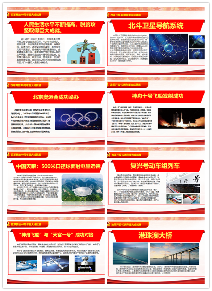 本次班会以“改革开放四十周年重大成就展”为主题,先后展现了人民生活水平不断提高,脱贫攻坚取得巨大成就;北京奥运会成功举办;神舟十号飞船发射成功;“一带一路”国家级顶层战略;“神舟飞船”与“天宫一号”成功对接;大国重器“蓝鲸2号”独步深海;港珠澳大桥建成通车等重大成就,引导同学们牢固树立“四个自信”和“共筑中国梦”的远大理想,以舍我其谁的气魄、笃定前行的信念,谱写对家国的忠诚赞歌。