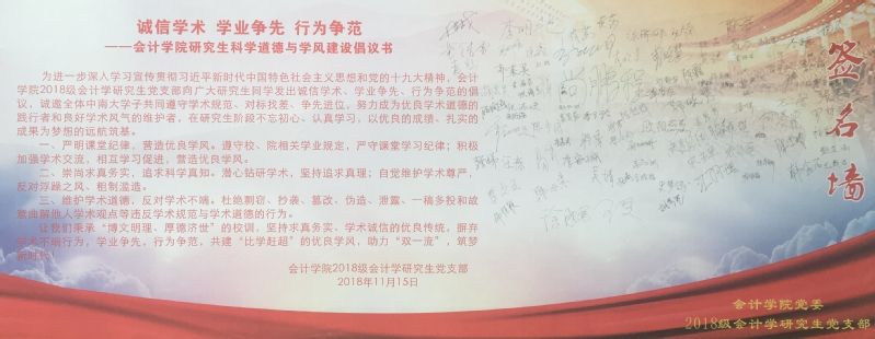 11月15日,研究生工作办公室组织全体2018级学历科学型硕士召开学术诚信道德教育主题班会。会上,以2018级会计学党支部牵头发出“诚信学术 学业争先 行为争范——银河研究生科学道德与学风建设倡议书”。2018级全体学历科学型硕士响应倡议,签字践行学术诚信,立志奋勇争先,成为优良学术道德的践行者和良好学术风气的维护者,在研究生阶段不忘初心、认真学习,以优良的成绩、扎实的成果为梦想的远航筑基。