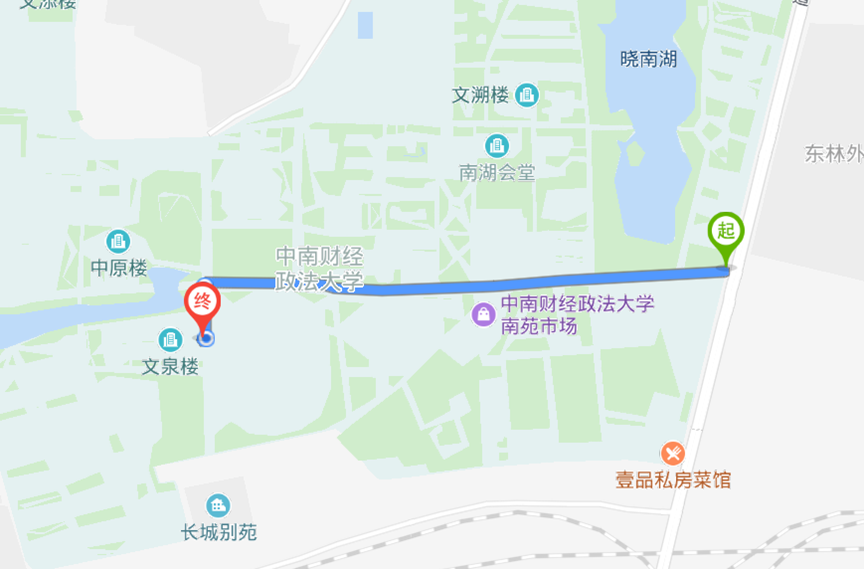 起点:武汉金谷国际酒店;终点:中南财经政法大学南湖校区文泉楼(步行约10分钟)