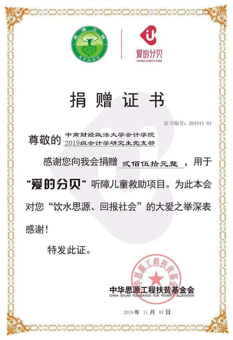 • 11月1日,2019级会计学研究生党支部收到了一张来自中华思源工程扶贫基金会的特别证书,感谢该支部为“爱的分贝”听障儿童救助项目捐赠善款的大爱之举。