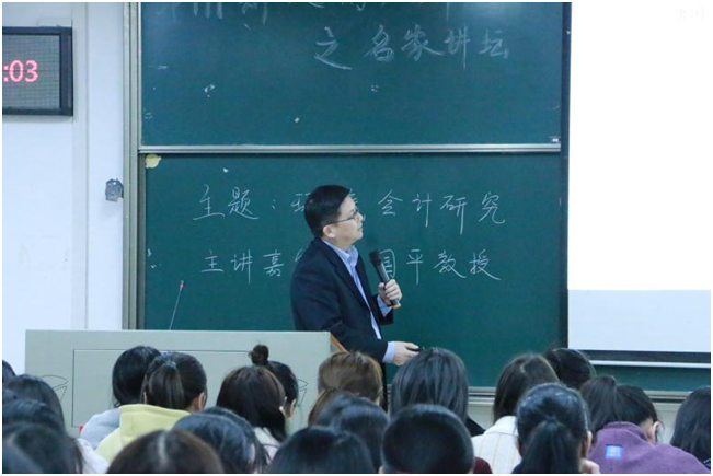 • 2019年12月3日晚7:00,由研究生院、党委研究生工作部和校研究生会主办,银河研究生会承办的第171期“文澜大讲堂”之名家讲坛在文添楼105举行。本次讲座由我院博士生导师唐国平教授主讲,主题为当今热门话题——环境会计研究。对于本次讲座,同学们热情非常高涨,现场座无虚席,约有一百五十多名同学参与。