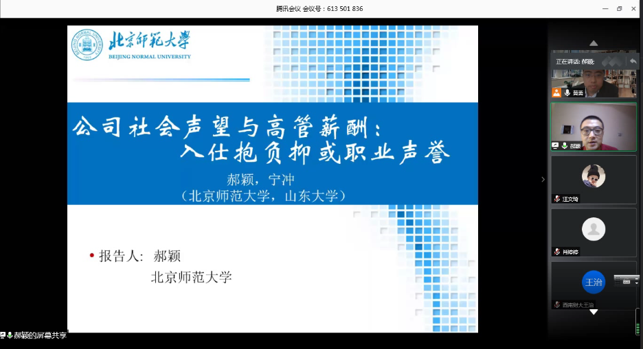 2020年9月24日,“中南·会计Seminar”第81期在腾讯会议线上成功举行。北京师范大学郝颖教授应邀为我院师生作了题为《公司社会声望与高管薪酬:入仕抱负抑或职业声誉》的学术报告。活动由黄勇老师主持,近150名师生在线参加了该活动,学术氛围热烈。