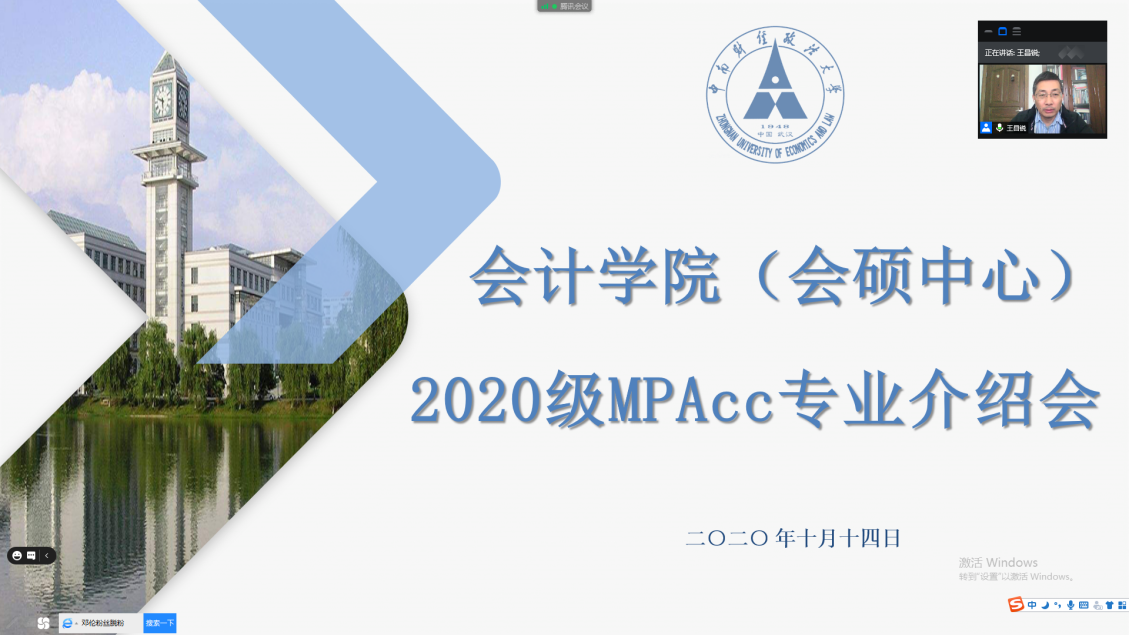 2020年10月14日中午12:45,yh86银河国际(会硕中心)2020级非全日制MPAcc专业介绍会于腾讯会议线上举行。yh86银河国际(会硕中心)副院长王昌锐教授、MPAcc导师组组长宋丽梦副教授、季华副教授、研究生工作办公室老师及2020级非全日制MPAcc全体研究生等参加此会议。会议由yh86银河国际(会硕中心)副院长王昌锐教授主持。