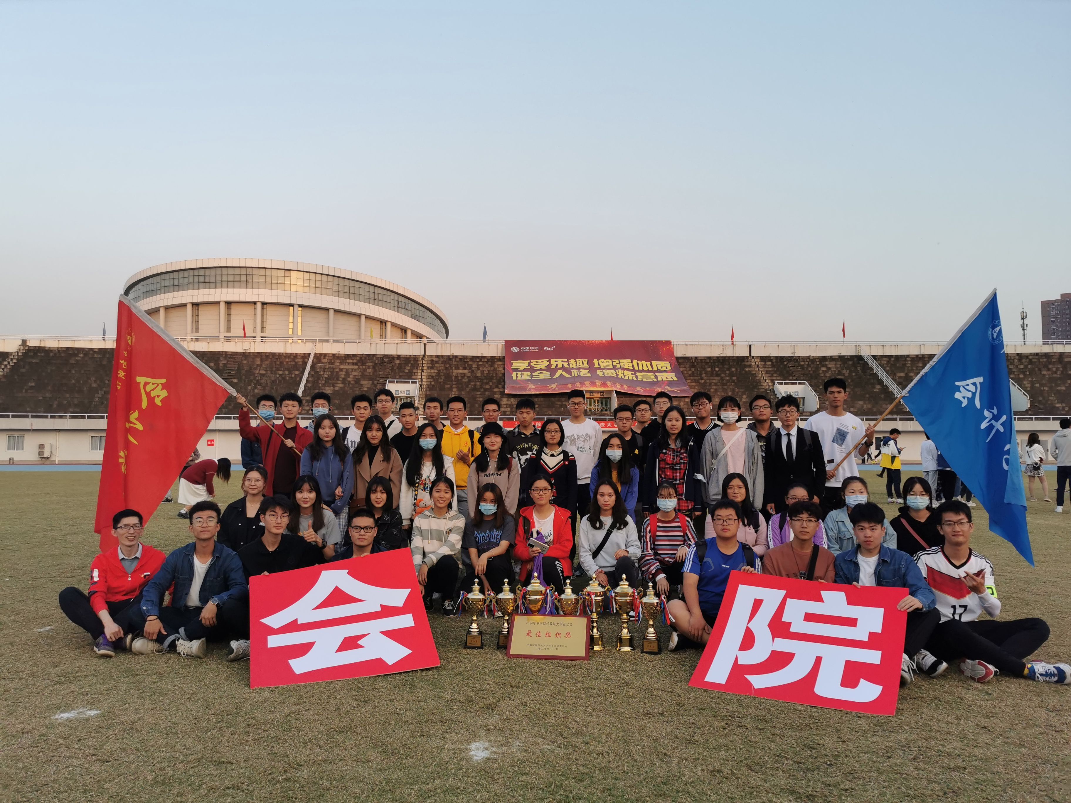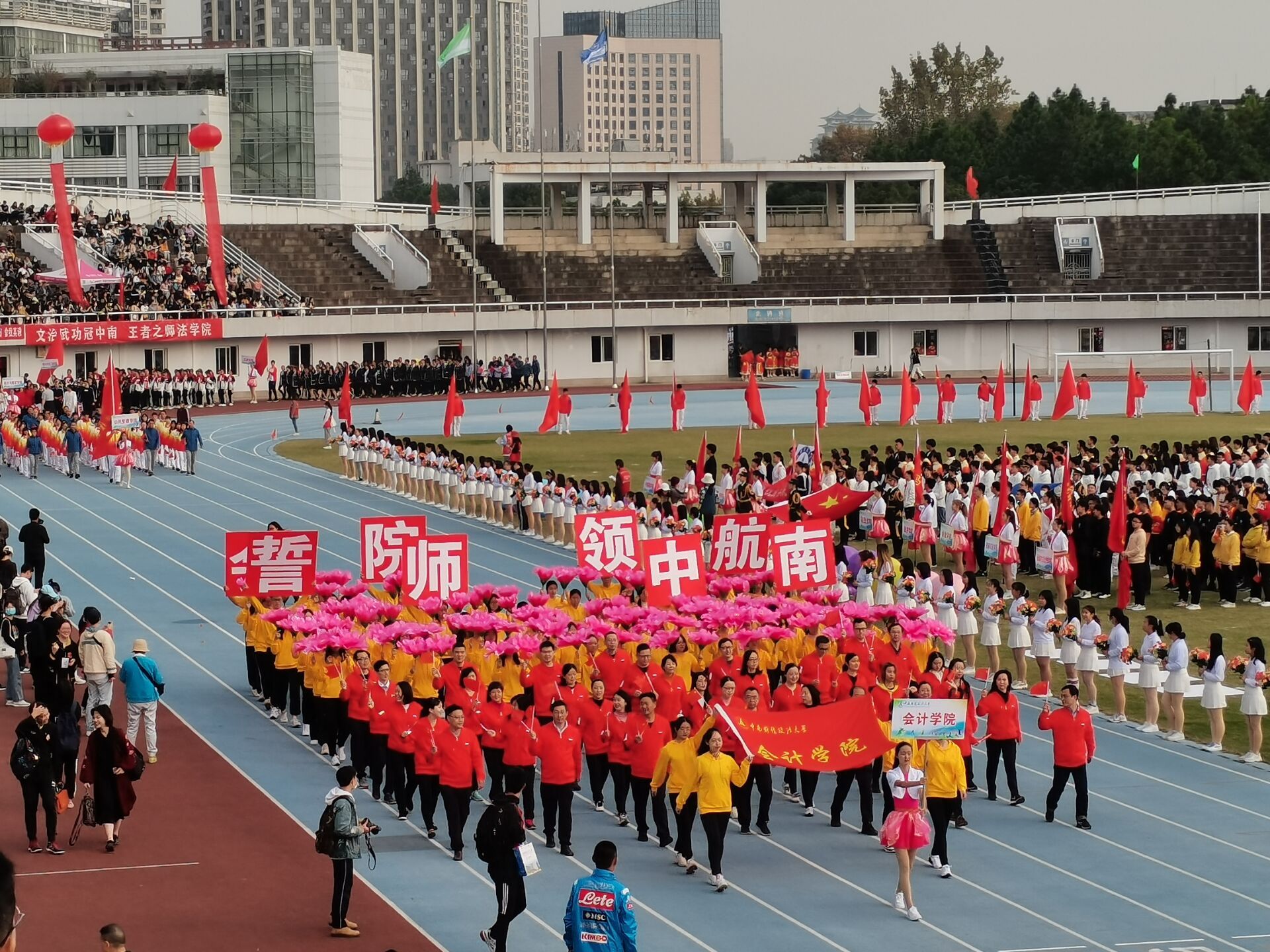 11月5日上午,中南财经政法大学2020年秋季运动会在南湖校区新体育场隆重开幕。此次运动会在南湖校区举行,教工和学生共同参加,历时3天。比赛项目分为田赛、径赛和集体项目三部分,分别在新体、旧体各场地举行。赛场上鼓声雷动,同学们呼声震天。开幕式上,会院方阵喊出了“文以载道,武以安邦,誓师中南,会院领航”这一响亮口号,充分展现了会院师生朝气蓬勃的精神状态。