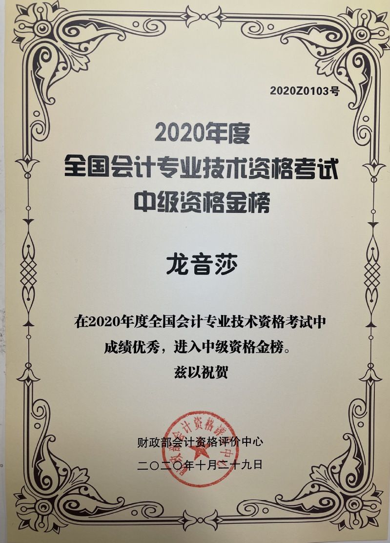 近日,2020年度全国会计专业技术中级资格考试金银榜出炉,yh86银河国际(会硕中心)优秀毕业生——2017级审计硕士龙音莎以财务管理97分、经济法93分、中级会计实务95分,总分285分的优异成绩名列湖北省第五位、全国第78位,荣获“金榜”表彰。
