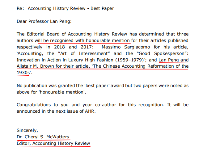 《Accounting History Review》编辑发邮函祝贺彭岚副教授的文章