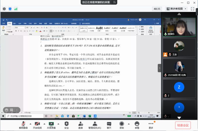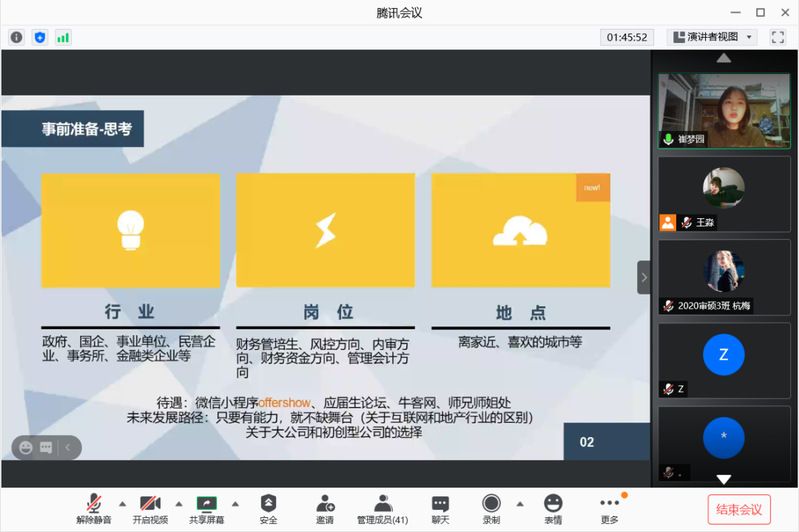 12月20日晚9点,由银河研究生会创新创业实践部承办的第68期“研职有道”之求职经验分享会活动圆满落幕。此次活动邀请2018级会计专业徐春美、2018级会计学专业黄骥枥、2019级审计专业崔梦园三位优秀学子,分别从考公考编、名企财务、互联网行业等多个方面,为同学们分享了在各大企业笔试、面试和实习的宝贵经验。