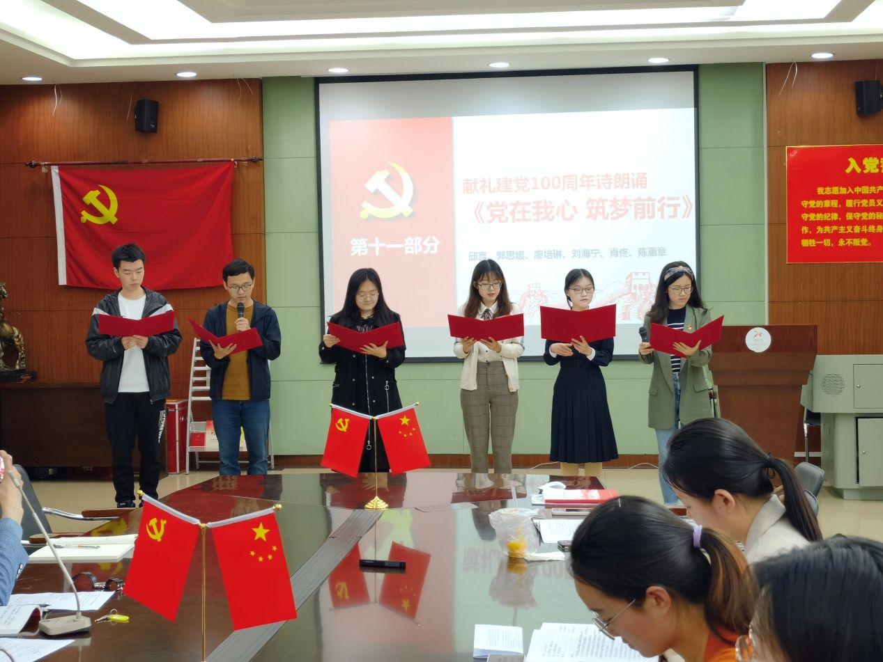 交流与讨论环节,由陈蕙章、邱言、郭思媛、廖培琳、肖佟、刘海宁六位同志为支部带来了献礼建党100周年主题诗朗诵《党在我心 筑梦前行》,声情并茂的朗诵表演带领大家重温了党的艰苦奋斗历程,讴歌建党100周年以来的辉煌成就,充分感染现场氛围,使支部活动形式更加丰富多彩。