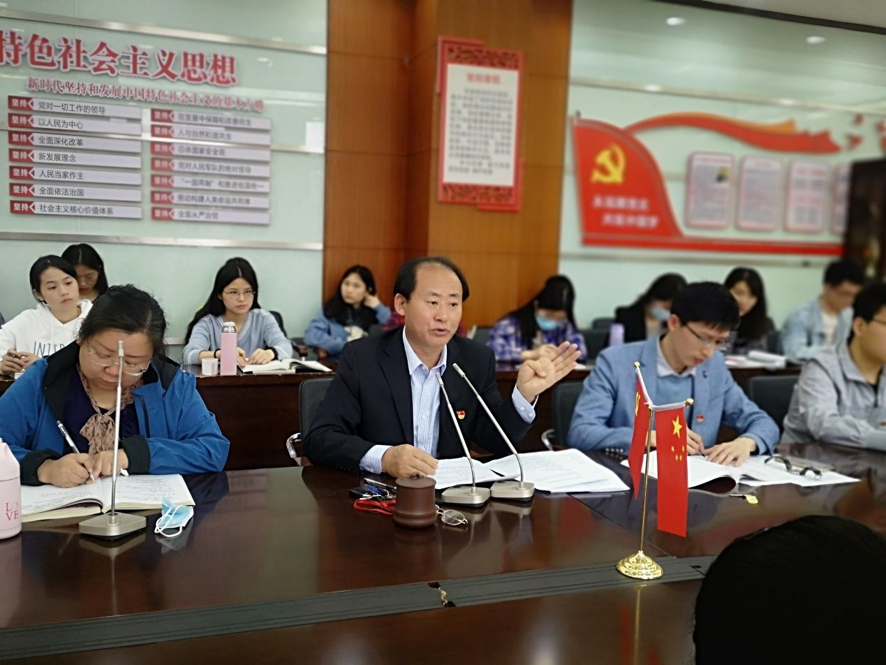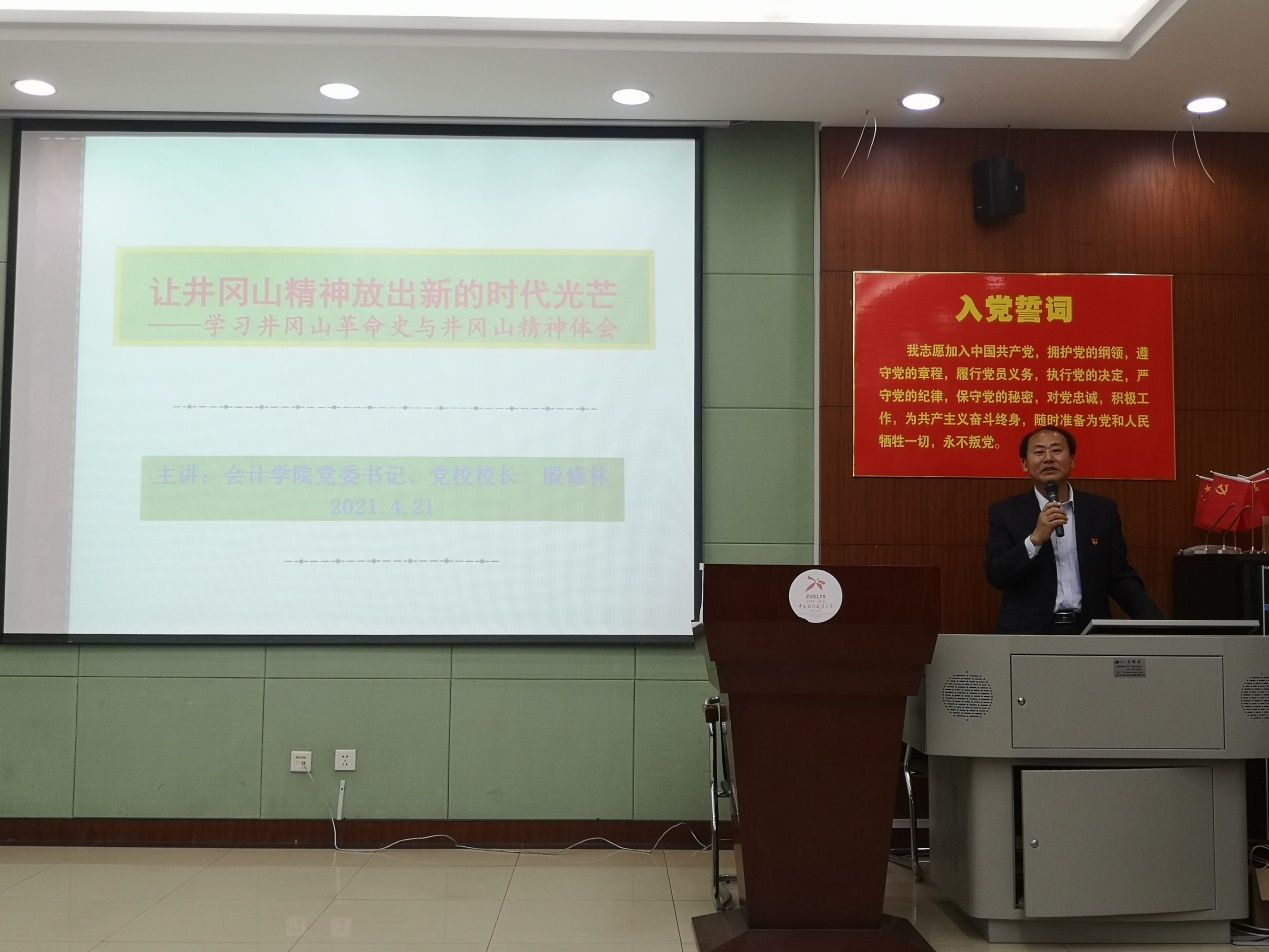 2021年4月21日上午,学校党史学习教育宣讲团成员、院党委书记殷修林教授参加本科2017级学生党支部四月份主题党日活动,并为学生党员讲授了题为《让井冈山精神放射出新的时代光芒》的党课。殷书记首先以习近平总书记的一段讲话入题,结合自身考察经历,重点介绍了井冈山精神的内核以及如何在新的历史条件下弘扬井冈山精神;接着,殷书记对井冈山革命根据地的历史概况、井冈山斗争发展阶段及其历史经验展开具体讲述,鼓励各位同志学习党史、坚定信念,保持艰苦奋斗的卓越精神;最后,殷书记以习近平总书记在清华大学建校110周年的讲话精神勉励同学们立大志、明大德、成大才、担大任,努力成为堪当民族复兴重任的时代新人,为实现国家富强、民族复兴、人民幸福的中国梦贡献自己的力量。