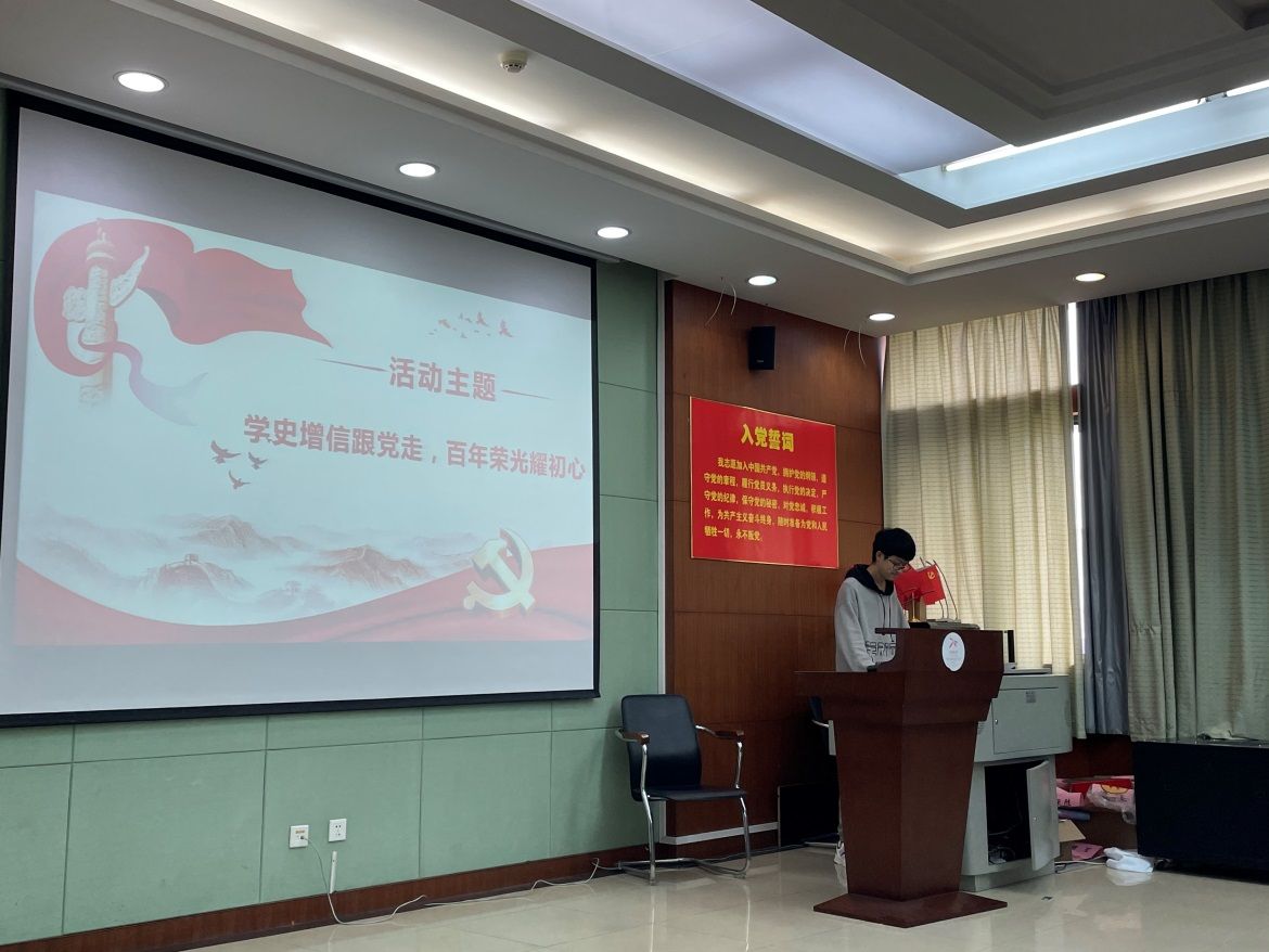(通讯员 孙丽颖)2021年4月23日,银河本科2018级学生党支部在文泉楼401会议室举办了“学史增信跟党走,百年荣光耀初心”主题党日活动。银河本科2018级学生党支部书记孟曰同志、副书记张昭妍同志以及支部44名预备党员参加了此次活动。会议由预备党员,年级团总支书记谢燕捷同志主持。