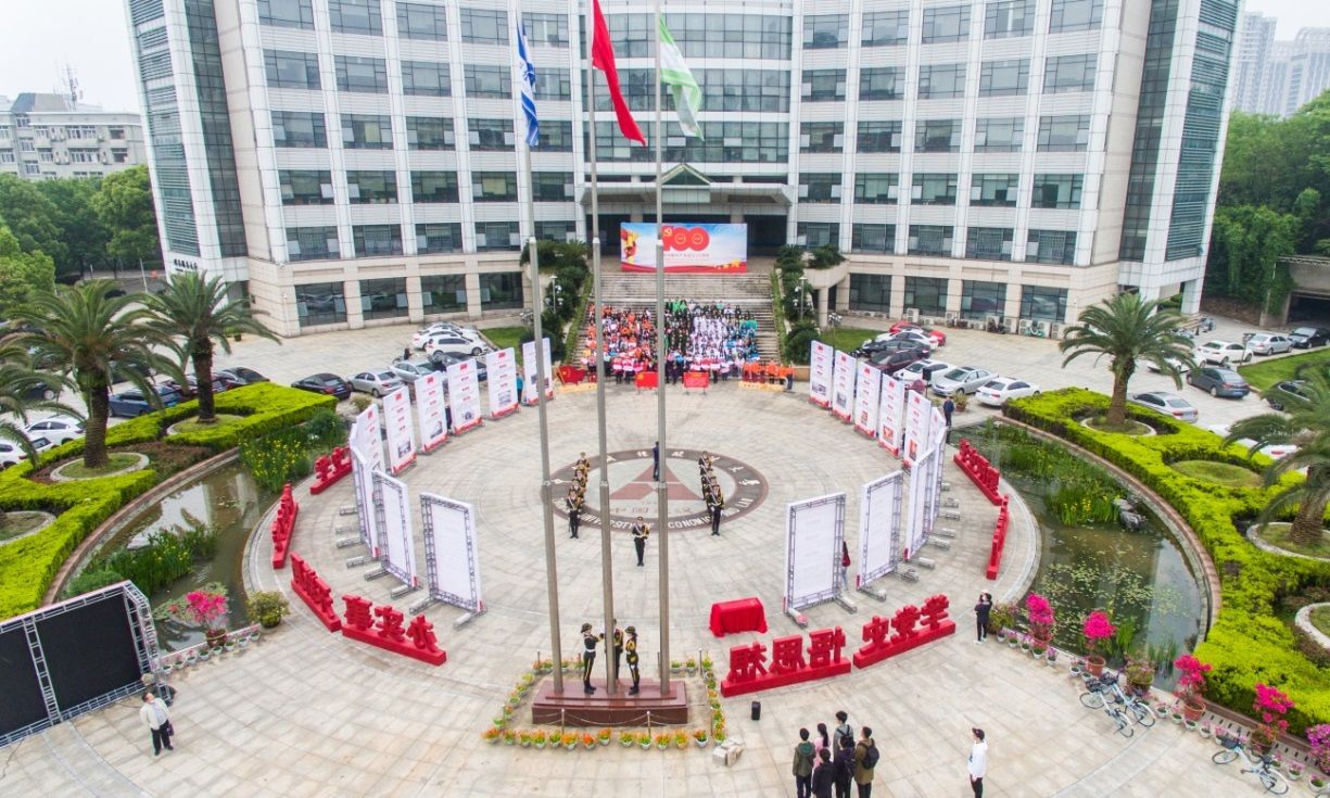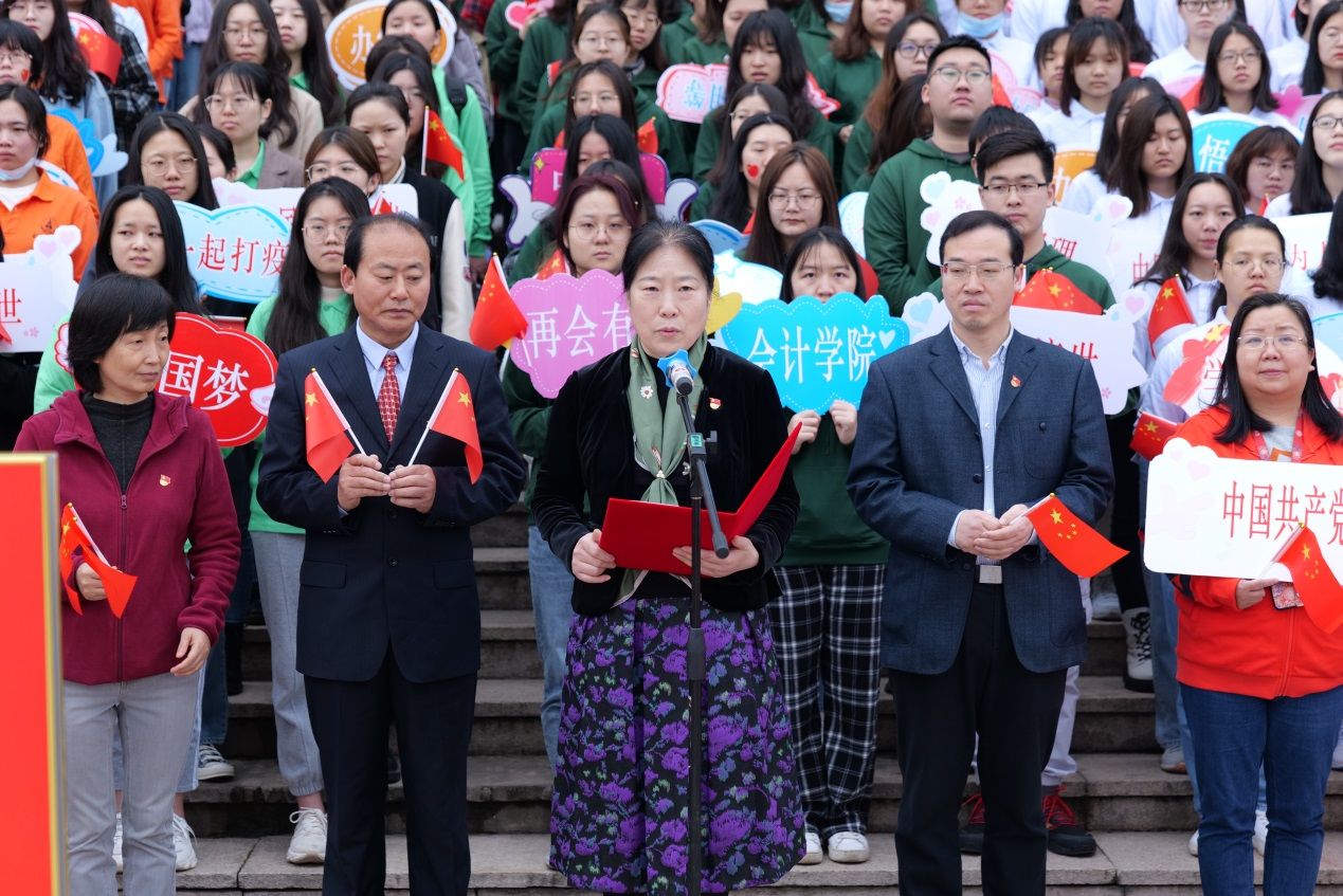 随后,毕业班党员代表陈蕙章、邱言、郭思媛、肖佟、刘海宁、廖培琳进行配乐诗朗诵《党在我心,筑梦前行》。相会江城,莘莘学子苦心孤诣,钻研东经西典,练成博文明理千般艺;共计天下,煌煌俊才意气风发,展翅北国南疆,建树厚德济世百年功。饱含深情、抑扬顿挫的朗诵将主题升旗活动推向了高潮,祝福每一位毕业生学子不忘初心,前程似锦,在实现中华民族伟大复兴的历史征途中续写新荣光。