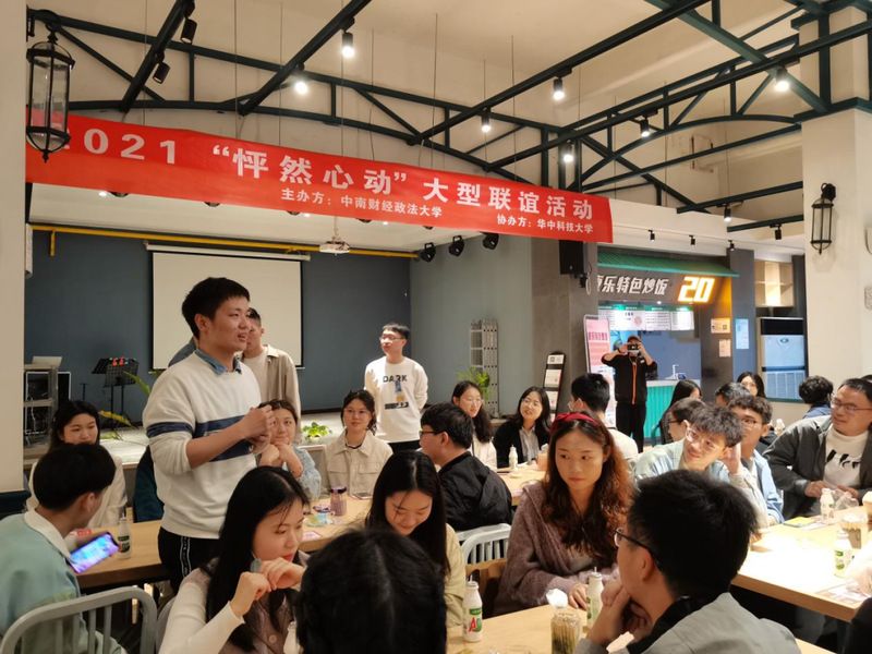 2021年4月24日下午2:30-5:00,由yh86银河国际研究生会与华中科技大学人工智能与自动化学院研究生会共同举办的“怦然心动”联谊活动在中南财经政法大学五食堂快乐食间顺利举行。本次活动旨在让同学们有机会认识和结交更多优秀的朋友,促进校际文化沟通交流以及丰富研究生的业余生活。