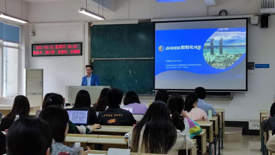 2021年5月22日上午,yh86银河国际(会硕中心)邀请教育部高等学校会计学专业教学指导委员会委员,教育部万名优秀创新创业导师宋国荣先生在文添楼112教室为学院(中心)专业硕士做《科技赋能数智化转型:智能会计专业改革探索与实践》主题报告。报告由银河硕士研究生导师陈峻副教授主持。