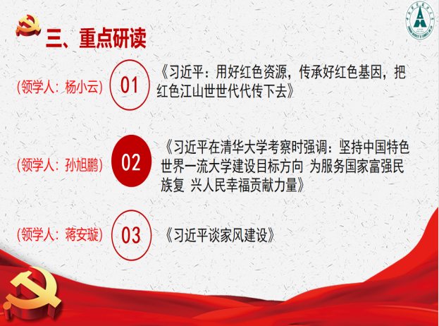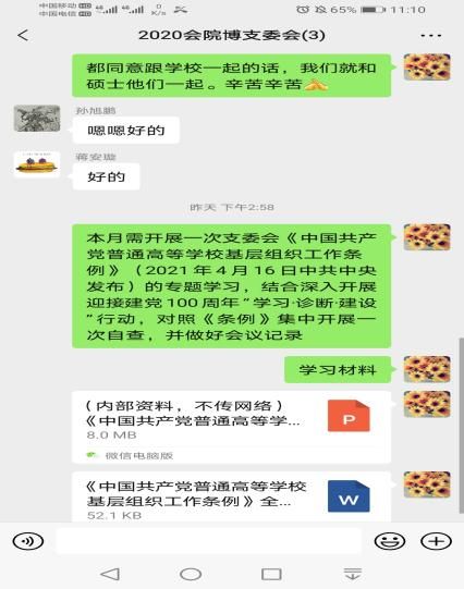 紧紧围绕“学史崇德铸忠诚,赓续精神葆本色”主题,博士2020级党支部全体党员重点研读了《中国共产党章程》总纲、《习近平:用好红色资源,传承好红色基因,把 红色江山世世代代传下去》、《习近平在清华大学考察时强调:坚持中国特色世界一流大学建设目标方向 为服务国家富强民族复 兴人民幸福贡献力量》和《习近平谈家风建设》等资料,集体观看了《榜样,你好—第2讲|狼牙山五壮士:共同的抉择》以了解红色历史人物以及《中国共产党章程的历史沿革》以了解红色历史,进一步赓续精神葆本色。会后,开展了支部委员会学习《中国共产党普通高等学校基层组织工作条例》,结合深入开展迎接建党100周年“学习·诊断·建设”行动,对照条例集中开展了一次自查工作。