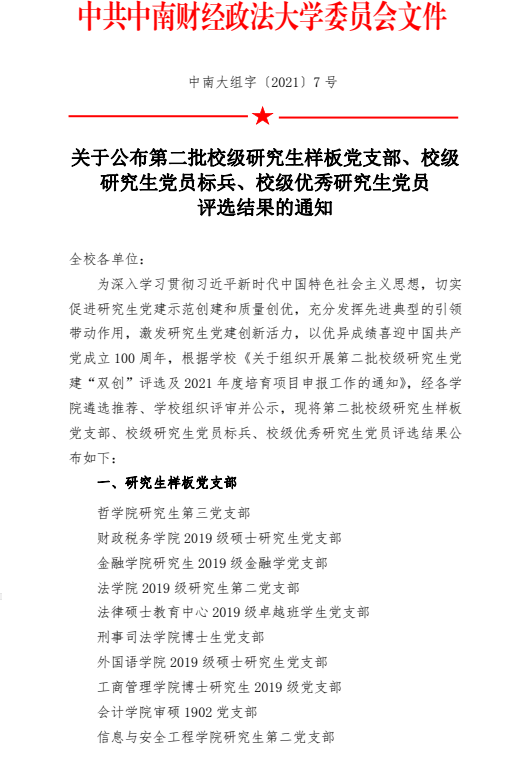 为深入学习贯彻习近平新时代中国特色社会主义思想,切实促进研究生党建示范创建和质量创优,充分发挥先进典型的引领带动作用,激发研究生党建创新活力,以优异成绩喜迎中国共产党成立100周年,学校于2021年初组织开展了第二批校级研究生党建“双创”评选及2021年度培育项目申报工作,经学院遴选推荐、学校组织评审并公示,近日正式公布结果——银河审硕1902党支部荣膺“校级研究生样板党支部”称号。