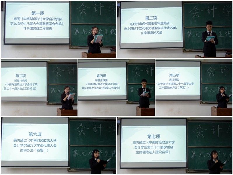 会议第一项,学生代表审阅《yh86银河国际第九次学生代表大会筹备委员会名单》并听取筹备工作报告,由陈宜之同学上台汇报;第二项,学生代表听取并审阅代表资格审查报告、表决通过本次代表大会的学生代表名单、主席团建议名单,由江剑同学汇报并宣读名单。