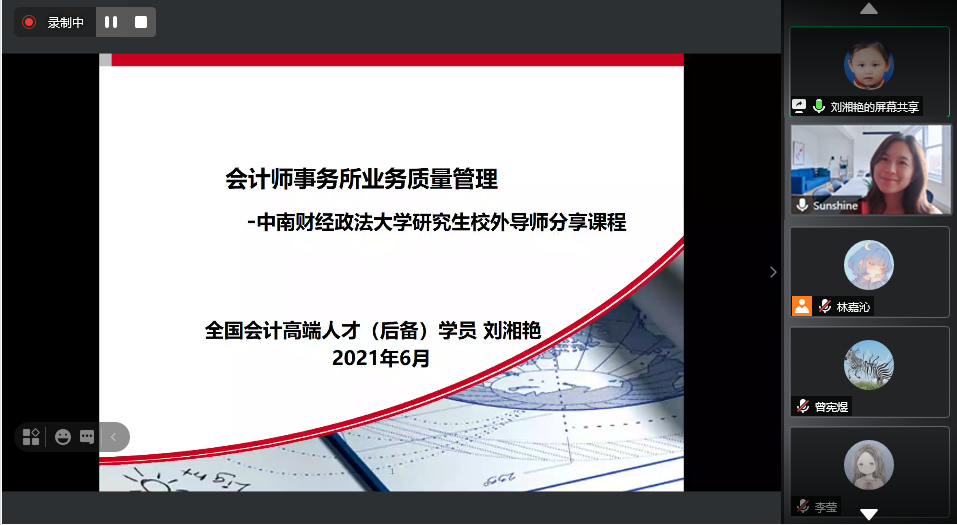 2021年6月25日,致同会计师事务所技术合伙人、全国会计高端人才(后备)、广东省注册会计师协会行业领军人才刘湘艳女士应我院陈丽红教授邀请,与我院专业硕士通过“腾讯会议”进行了主题为“会计师事务所业务质量管理”的课程分享。刘湘艳女士在授课过程中通过引入自身执业经验与多个相关案例,对质量管理这一主题进行了声情并茂的阐述,活跃融洽的课堂氛围正展现了当代会计领军人才对促进行业发展时代重任的担当。