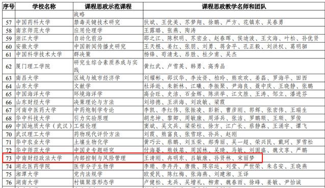 5月28日,教育部发布了《教育部关于公布课程思政示范项目名单的通知》(教高函【2021】7号),我院(中心)王清刚教授团队主讲的审计硕士必修课程和会计硕士选修课程——《内部控制与风险管理》获评“教育部课程思政示范课程(研究生)”,王清刚教授团队获评“课程思政教学团队(研究生)”,王清刚、冉明东、吕敏康、孙贤林、宋丽梦获评“课程思政教学名师(研究生)”。