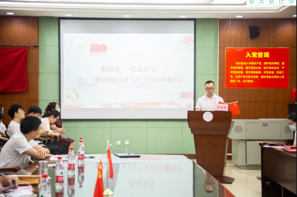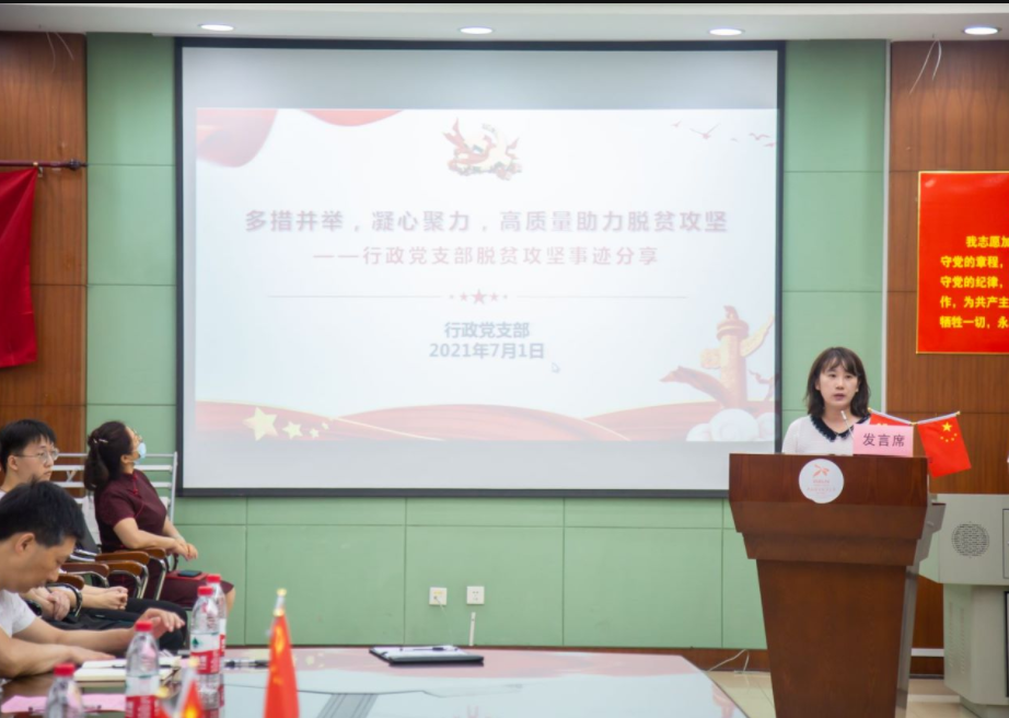 “脱贫攻坚先进集体”代表行政党支部副书记赵侃介绍行政党支部多措并举,凝心聚力,高质量助力脱贫攻坚事迹。从结对资助贫困学子对口帮扶红石村、箭坝村,到爱心购买贫困地区农副产品开展消费扶贫。行政党支部将继续拥护院党委的领导,发挥支部特色优势,高质量完成定点帮扶任务,助力脱贫攻坚,同时以党史学习教育为契机,努力为师生办实事,向先进典型学习,为银河各项事业发展贡献力量。