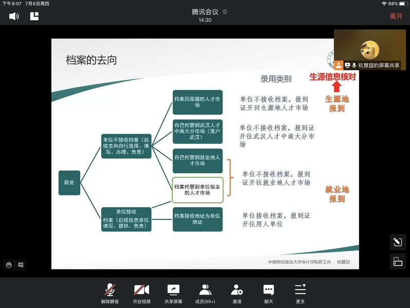 研究生辅导员杭慧喆做就业动员和生源信息审核专题辅导,简要介绍了2020、2021届就业情况并详细说明了生源信息审核的要点,希望同学们根据自身的特点,转变就业观念,调试择业心理,学会自我评价,准确定位就业目标,为自己的就业做好充足的准备。