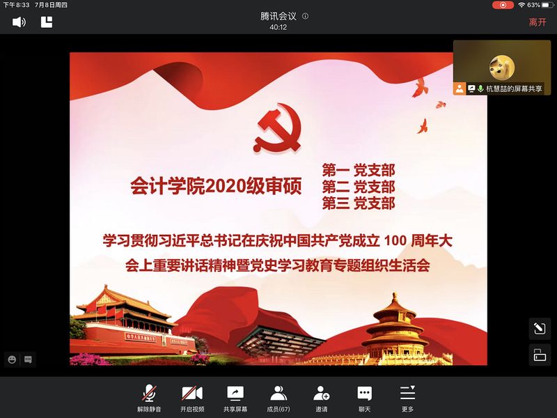 7月8日晚8:30,2020级审硕第一党支部、第二党支部、第三党支部联合于线上开展学习贯彻习近平总书记在庆祝中国共产党成立100周年大会上重要讲话精神暨党史学习教育专题组织生活会。联系支部的院党委委员王华副院长、王昌锐副院长全程与会,并给予指导。