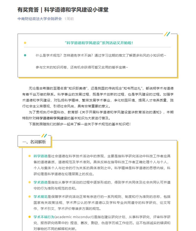 11月25日下午14:00,由中南财经政法大学研究生院、党委研究生工作部和校研究生会主办,银河承办的“科学道德和学风建设宣讲教育”活动在文添楼105成功举办。本次活动主题为“研精覃思,明德任责”。学院近300名硕、博研究生以线下或线上形式参与了本次活动。