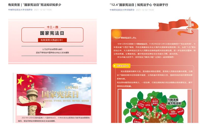 12月2日,研究生会发布《知宪法于心 守法律于行》主题宣传和“国家宪法日”宪法知识知多少有奖答题活动,同学们的法律意识得到了普遍提高,知法、懂法、守法、用法的观念得到了进一步增强。