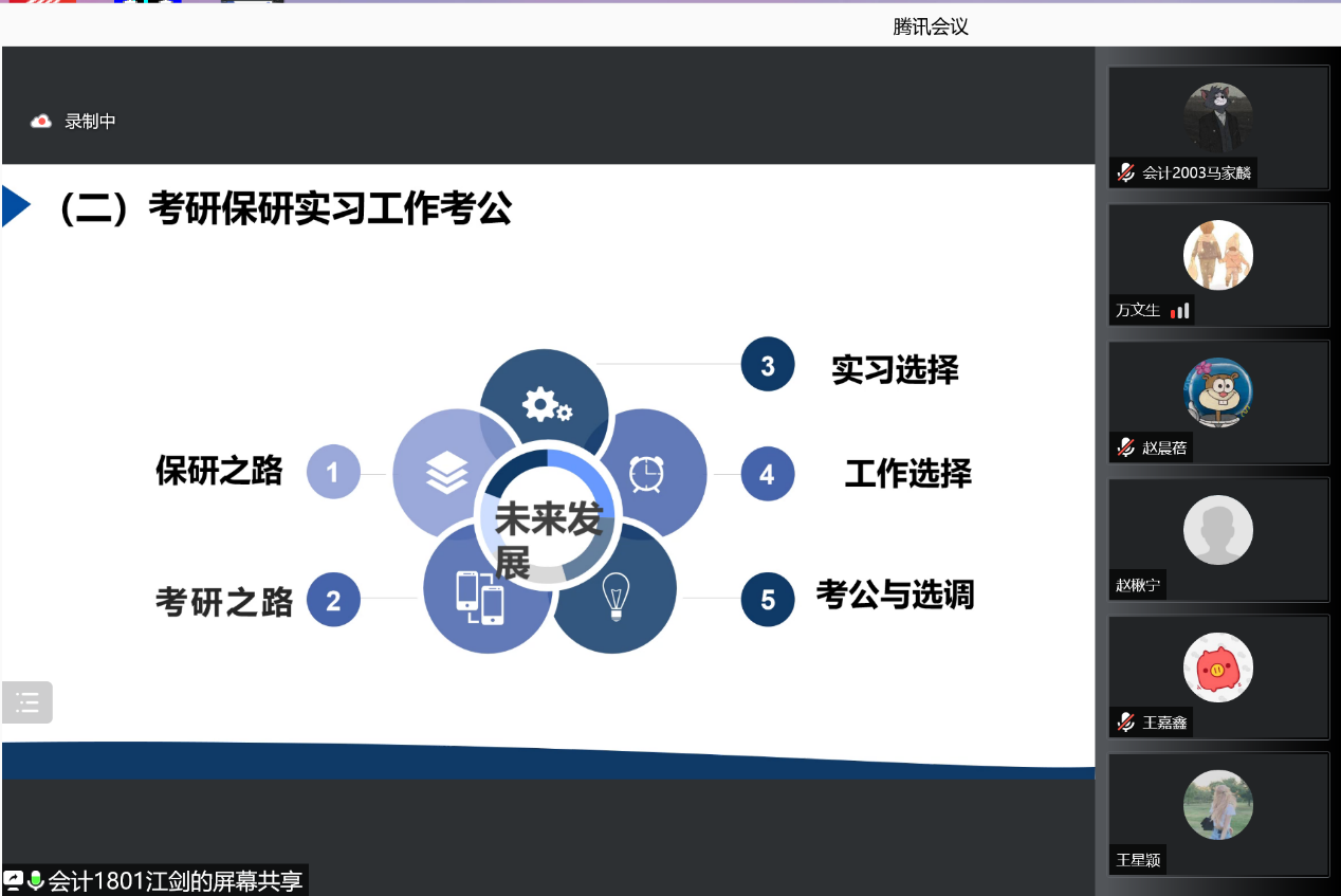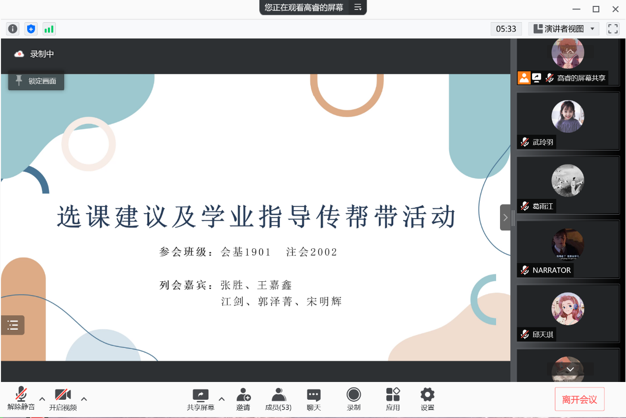2021年12月30日19:00,在学院领导、各位老师的共同努力下,会基1901、注会2002班班导师活动——暨选课建议及学业指导传帮带活动于线上平台召开,注会2002班和会基1901班全体同学参与会议,并有多位其他班级学生慕名参加,受到了广泛好评。本次会议在银河冉明东副院长的大力支持下,由银河王嘉鑫组长主持,邀请到审计系张胜主任出席,并由注会2002班团支书高睿做分项目主持介绍。