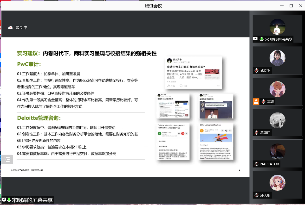 实习方面,他建议本科期间多参加专业相关的实习,并具体以普华永道审计和德勤管理咨询两段实习为例,详细解读了各自的工作特点和能力要求,真实地还原了入职体验。此外,他还从经典职业道路的入局讲到行业新风向的展望,指出了当前事务所数字化转型的大趋势以及对数据处理能力的需求。商赛活动方面,宋明辉师兄强调“大学是试错成本最低的时候”,鼓励我们通过参加商赛和组织活动,全面地建立商业分析能力、培养舞台表现能力、提高组织管理能力,这些能力对于我们未来的职业发展至关重要。