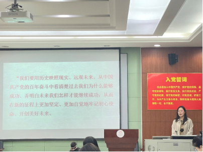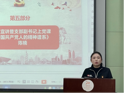 接下来的党史理论宣讲中,党支部副书记陈楠老师为支部同志讲授了一堂题为《中国共产党人的精神谱系》的党课。她带领大家回顾了中国共产党百年历程和挑战,从中国共产党精神之源的伟大建党精神谈起,强调建党精神是战胜挑战的精神支柱和强大动力,而后分析了中国共产党精神在不同时期不同历史任务中具体表现和基本内涵,最后鼓励支部同志不断学习领悟精神谱系的深刻内涵,始终弘扬党的精神,赓续红色血脉。