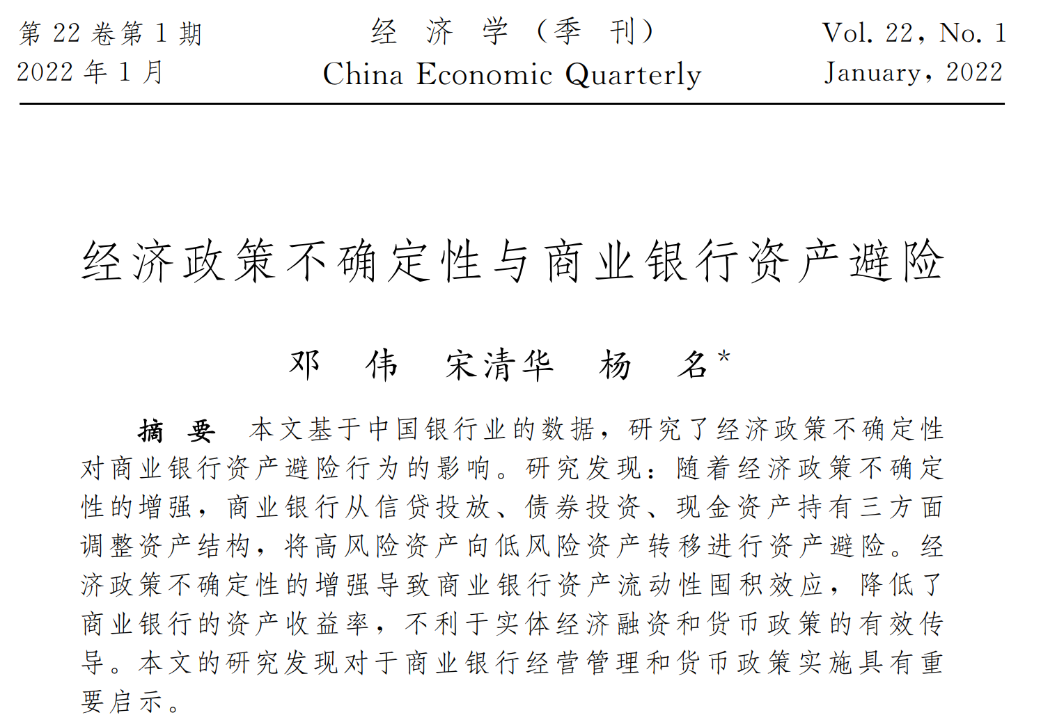 近日,由银河2018级学术型硕士研究生杨名及其导师邓伟副教授、金融学院宋清华教授合作完成的论文“经济政策不确定性与商业银行资产避险”被《经济学(季刊)》正式接受并发表。《经济学(季刊)》是由北京大学主管、北京大学中国经济研究中心主办、北京大学出版社出版的经济学综合性刊物,该刊发表原创性的理论、经验、综述和评论性的中文经济学论文,是我校认定的A-期刊。