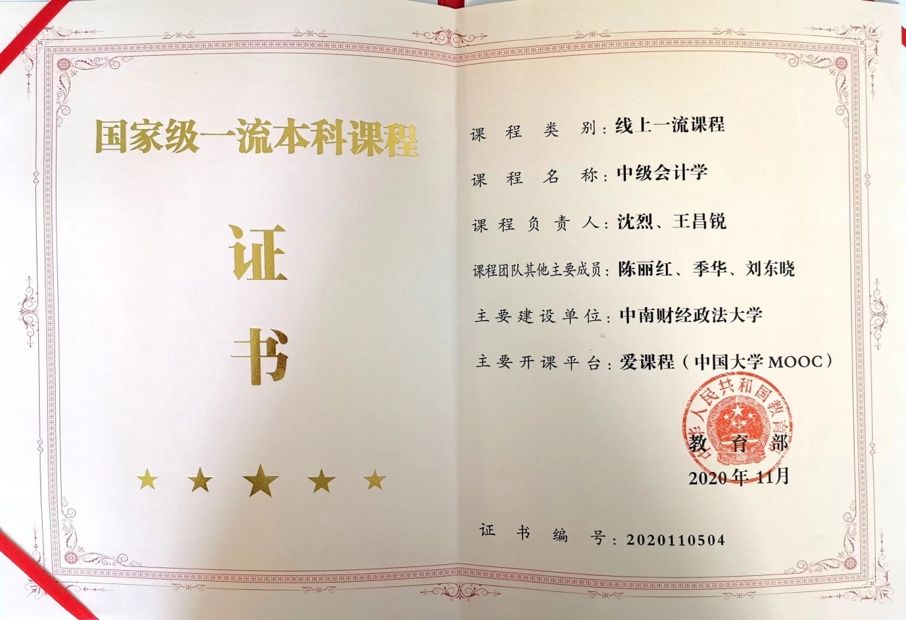 我校《中级会计学》课程在国内居领先地位。本课程是我校会计学国家重点学科、国家级一流本科专业会计学和财务管理的重要建设项目,经过几代人、数几十年的艰苦努力,《中级会计学》课程建设取得了突出成绩,1997年和2002年分别被评为第二届和第三届“湖北省高等学校优质课程”;2004年被评为“湖北省省级精品课程”;2006年、2013年、2019年分别获评国家级精品课程、国家级精品资源共享课程和国家级一流本科课程。