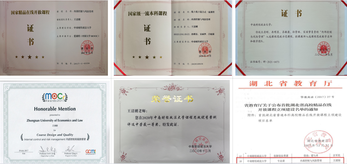 中南财经政法大学“内部控制与风险管理”课程团队立足中国企事业单位实际,秉持培育德才兼备卓越管理人才的根本任务,坚持立德树人,以持思政引领,科技赋能,多元创新课程育人,先后荣获湖北省高校精品在线开放课程、国家级线上一流课程、国家线上线下混合式一流课程、国家级课程思政示范课程、教学名师和教学团队、学校课程思政教学优秀案例一等奖等荣誉称号。课程建设成果突出,拥有国内领先、国际一流的专业课程线上资源。课程MOOC已在中国大学MOOC、学堂在线和学习强国等多个平台上线运行。截至2021年底,课程累计受益过百万人次,学习强国平台上,部分视频观看量超过400万人次,200多所大学基于本课程开设有SPOC课堂,100多所大学选用团队编写的教材,包括很多一流大学。课程不仅得到在校学生和线上学员的喜爱,团队还通过管理咨询、课题研究、职业培训等多种途径,在社会上产生了深刻影响,形成广泛影响力的“品牌”课程。在职业培训方面,仅铁路系统员工培训,受众就达4000多人次。湖北教育电视台、楚天金报等多家媒体专门对课程效果进行了报道,多家网络媒体也对课程特色与效果进行宣传和报道。