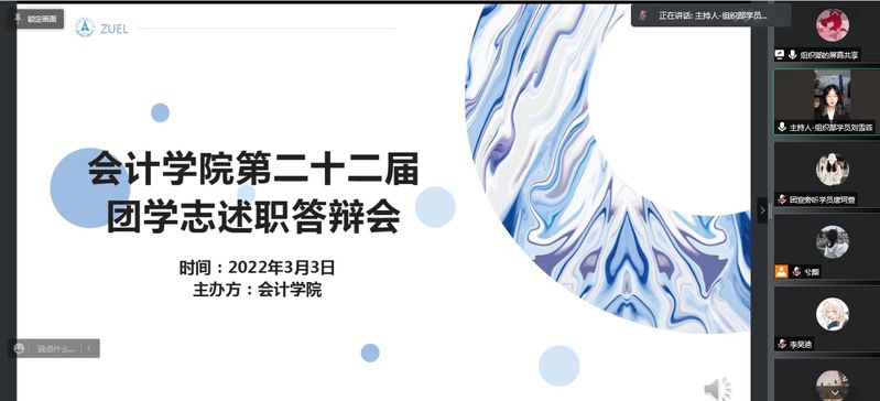 2022年3月3日下午两点,银河第二十二届团学志述职答辩会顺利开展。述职答辩会旨在加强各部门间的合作与联系,总结上学期工作经验与不足,展望新学期工作开展方向。为落实学校疫情防控要求,本次述职答辩采用线上线下相结合的形式举行。银河团委书记陈俊华老师,团委副书记杭慧喆老师以及团学志主席团成员,各部门部长、副部长与全体学员参加了本次活动。