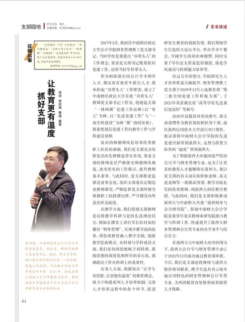(通讯员 畅雅莉 吴卫华) 近日,《党员生活》杂志以《抓好支部 让教育更有温度》为题,报道了全国党建“样板支部”中南大银河财务管理党支部建设成果。学院副院长、财务管理党支部书记李四海教授接受了该刊记者采访,展现了全国样板党支部“样板”形象。