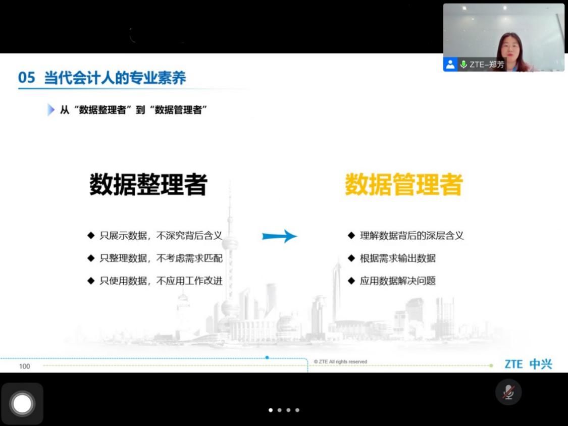 最后,郑芳部长通过分享中兴财经的数字化转型历程,分析了数字化时代下的财务变革趋势以及财务人才素质模型,就财务人员如何从“数据整理者”到“数据管理者”,如何从“账先生”到“价值挖掘者”,给予同学们建议和启发。