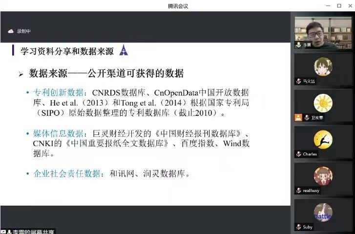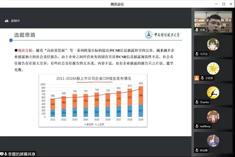 李震介绍了他的时间安排和选题思路:通过自己搜集资料整理出2011-2019年A股上市公司CSR报告发布情况,介绍企业披露社会责任报告的大致情况,并就具体的研究设计、变量定义的代码等向大家进行了介绍,提出了几点建议:学中干;主动与师兄师姐交流学习;忌闭门造车;勇于向导师交流想法;保持独点性,忌依赖导师;保持原则性与灵活性。