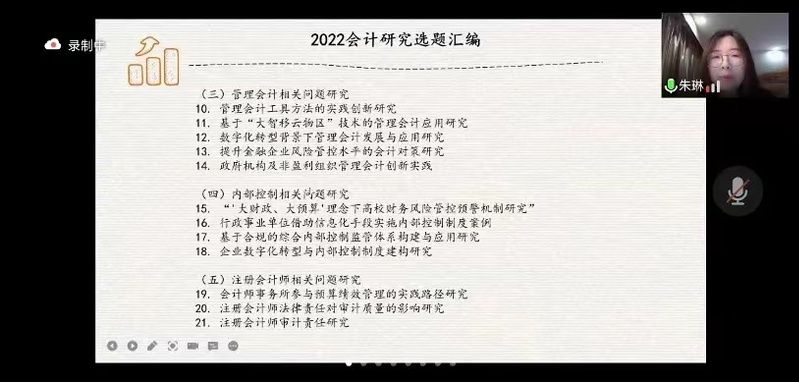 首先朱琳就如何撰写文献综述、如何阅读、整理、运用文献进行了经验分享,从避免“撞衫”、发现问题、查找已有工具、获得启发四个方面举例说明了撰写文献综述的技巧;建议大家运用图表和示例,在精读文献时使用表格进行记录,在整理文献时根据细分领域进行汇总,在运用文献时先对摘录的文献进行汇总,尝试用自己的语言说出来。此外,朱琳还分享了一些2022年会计研究选题,在管理会计相关问题研究方面,可以尝试数字化转型背景下管理会计发展与应用的研究、基于“大智移云物区”技术的管理会计发展与应用研究。