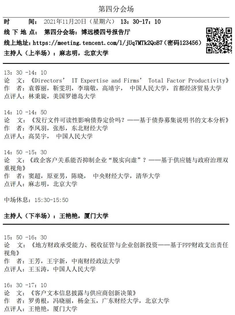本次会议主题为“会计与现代化经济体系发展”,来自北京大学、清华大学、中国人民大学、不列颠哥伦比亚大学、美国德克萨斯大学等国内外高校的专家学者受邀参会。会议共分五个分会场,与会学者围绕相关议题深入研讨,广泛交流,精彩纷呈。在由北京大学麻志明副教授和厦门大学王艳艳教授分别主持的第四分会场中,我院王芳教授和王宇新硕士报告了题为《地方财政承受能力、税收征管与企业创新投资——基于PPP财政支出责任视角》的论文,在会上得到了中国人民大学王玉涛教授的精彩点评。