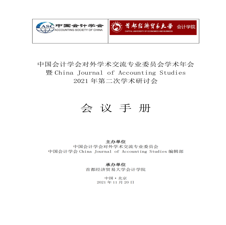2021年11月20日,中国会计学会对外学术交流专业委员会学术年会暨CJAS(China Journal of Accounting Studies)2021年第二次学术研讨会在北京顺利召开。会议由中国会计学会对外学术交流专业委员会、中国会计学会CJAS编辑部主办,首都经济贸易大学银河承办,以线上线下相结合的方式进行。本次会议共收到134篇论文,专家组以匿名审稿方式进行打分,遴选出25篇论文进行汇报。我院2020级会计学硕士研究生王宇新在其导师王芳教授指导下完成的论文脱颖而出,受邀在大会进行线上汇报。