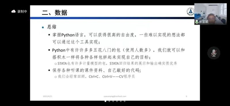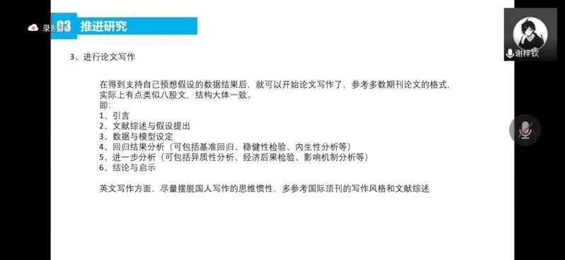 余宣颖主要就选题、数据搜集、整理和清洗、实证结果、论文撰写等内容分享了自己的经验。他先分享了从宏观到中观、微观的选题思路,接着从数据来源渠道、数据整理方法、数据软件学习方法三方面向大家介绍了有关数据处理的方法,并推荐了数据库、软件学习的课程等学习资源。当回归结果不理想时,他建议大家通过检查数据清洗过程,更改主要解释变量衡量方式,修改研究设计等方法解决问题。