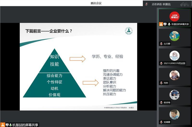 随后,研究生辅导员杭慧喆从档案及档案的去向、生源信息审核、三方协议、公务员与选调生等知识要点,从心理测评、简历制作、面试技巧等方面分享了求职各环节的经验,梳理了2023届毕业生就业日程安排与注意事项,帮助学生明确任务和要求、调整就业心态、把握就业机会,早日找到施展才华的舞台。