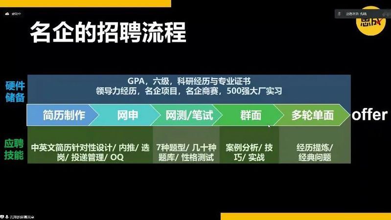 随后,孔老师为大家介绍了名企的招聘流程:一般分为网申、网测、群面和单面几个环节,每个环节都对应一些储备需求。应对招聘,所需的储备一般分为硬件条件和应聘技能两种。其中,硬件条件指自身的专业技能水平、英语水平和实习经历等;而应聘技能则包含简历设计、网测技巧和面试技巧。
