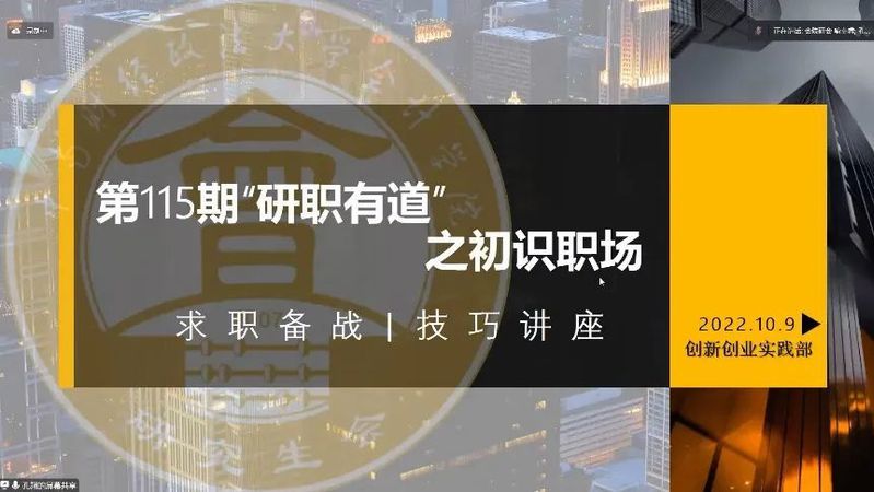 2022年10月9日19:00,银河研究生会成功承办第115期“研职有道”之初识职场——求职备战&技巧讲座。本次讲座特邀思成求职的孔翔老师作为主讲人,分享研究生阶段的求职规划和面试经验。