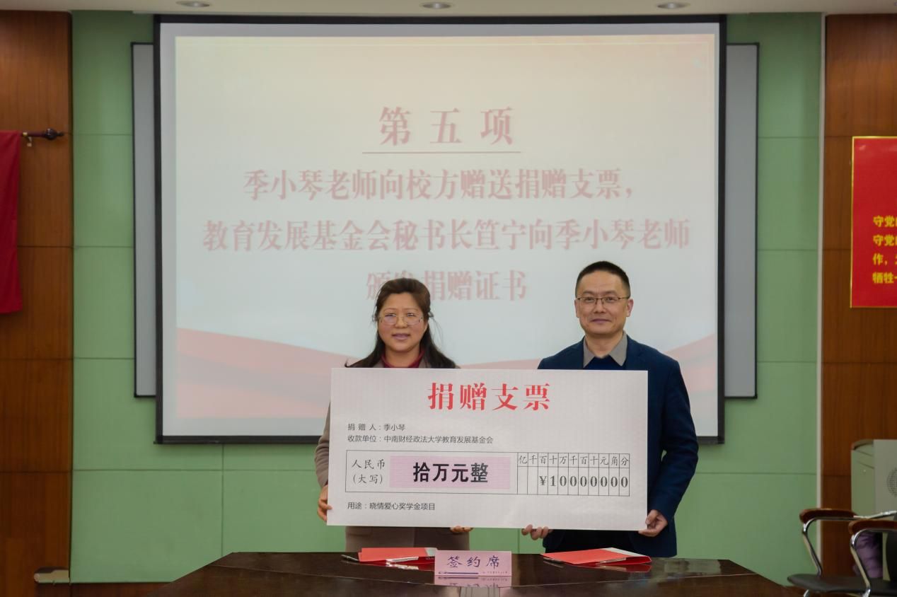 笪宁部长在致辞中指出,季小琴老师长期以来为有困难的学生提供帮助、捐献爱心,本次又个人捐资10万元设立“晓情爱心奖学金”,用于支持和奖励优秀且贫困的学子圆梦成才,帮助他们解决后顾之忧,顺利完成学业,这不仅是一份爱心和资助,更充分展现了季老师对母校的深情厚谊,对“博文明理 厚德济世”校训的传承和践行。