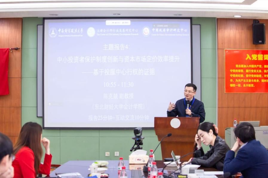 东北财经大学陈克兢教授以“中小投资者保护制度创新与资本市场定价效率提升——基于投服中心行权的证据”为主题展开精彩讲述,分情况介绍了投服中心行权效果的影响因素;中南财经政法大学陈丽红教授以“中美跨境审计监管:冲突与未来”开展主题汇报,从监管冲突历程、潜在挑战、应对策略和政策跟踪四个方面与与会人员分享。