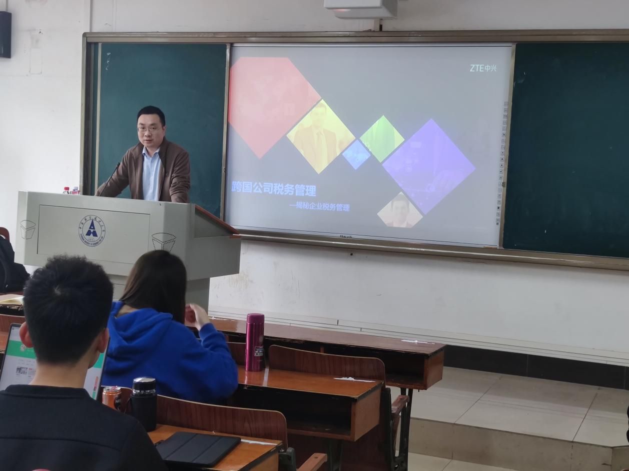 为促进同学们对行业发展趋势、前沿问题等有更深层次的了解,拓宽视野,增强专业素养和就业竞争力,4月14日上午,中兴通讯全球税务总监解文伟先生应邀在文添楼208为《财会审前沿问题研究》课程的同学们进行授课。本次课程由专硕导师组组长季华副教授主持,主题为“跨国公司税务管理—揭秘企业税务管理”。